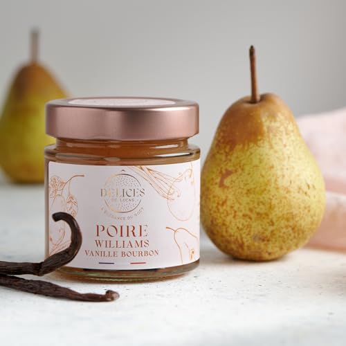 Ô Délices de Lucas – Confiture Poire & Vanille de Madagascar 60% Fruits – Artisanale et Fabriquée en France – Pot en Verre 230 g – Gastronomie Française60 % DE POIRES : Poires sélectionnées à pleine maturité pour une chair fondante et un goût naturellement sucré. VANILLE DE MADAGASCAR : Gousse entière de vanille pour une note épicée et boisée infusée au cœur de la confiture. CONSISTANCE ONCTUEUSE & MORCEAUX FONDANTS : Cuisson lente en poêlon de cuivre qui préserve texture et éclats de fruit. RECETTE 100 % NATURELLE : Poire 60 %, sucre de canne 36 %, jus de citron concentré 1 %, gousse de vanille 1 %, agar-agar 2 % – zéro colorant, zéro conservateur. SOUTENEZ L’ARTISANAT LOCAL : Élaborée et conditionnée en France, valorisant le savoir-faire confiturier et le terroir.