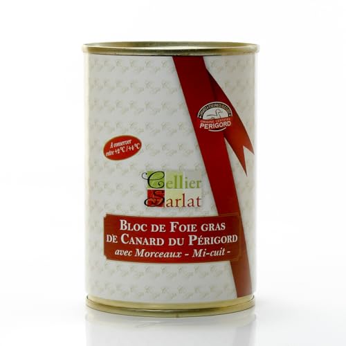 Bloc de Foie Gras de Canard mi-cuit IGP Périgord 400gConseils de préparation : Conservez votre foie gras au réfrigérateur. Dégustez le accompagné de toasts de pain de campagne, associé à un joli Côtes de bergerac moelleux (à consommer avec modération). Dégustez rapidement après ouverture. Conseils de conservation : A consommer de préférence avant la date indiquée sur la boîte. Ingrédients : Foie gras de canard du Périgord (origine France) morceaux de foie gras de canard du Périgord 30% (origine France), eau, sel, poivre. Fabriqué dans un atelier utilisant : œufs, vin (sulfites) , lait, graine de sésame, noix et moutarde Valeurs nutritionnelles : Energies : 2001 Kjoules 486 Kcal Protéines: 6,5 g Lipides: 50g Dont acides gras saturés: 22 g Glucides: 2,4g Dont sucres : 1,4g Fibres: inférieur à 0,1g Sel: 1,3g Conditionnement : 400g Nombre de parts : 8