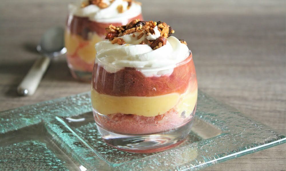 Cette verrine marbrée se compose d’une compote de rhubarbe au gingembre, de biscuit rose de Reims imbibé au sirop d’agave et eau de vie, d’une crème pâtissière aux graines de vanille et d’une crème chantilly. La saison de la rhubarbe est tellement courte qu’il faut profiter de ce fruit à la saveur acidulée tellement unique à travers différentes recettes.