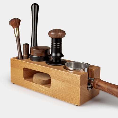 Guolich Tamper Station 51-58mm Universelle Café Tamper Fabriqué en hêtre de Barista Accessoires pour Machine à Expresso Barista et Machine à Expresso Convient à Porte Filtres, Espresso Tamper【Matériau de qualité supérieure】la station tamper est adaptée pour les porte-filtres de 51 mm et 54 mm et est en bois de hêtre naturel. Il a un grain unique et peut être utilisé longtemps. Il est résistant aux chocs et durable, avec une texture robuste. 【Réglable en hauteur】l'écrou sur cette station de tamper en bois permet un réglage libre de la hauteur pour stabiliser le porte-filtre, ce qui vous permet de presser constamment la poudre et de réduire les vacillements. Le fond avec coussinets en caoutchouc empêche efficacement le glissement et l'usure, et la poudre pressée est plus stable et plus économique. 【Multifonction】la station de tamper en hêtre dispose de cinq trous sur mesure dans lesquels sont placés des porte-filtre de 51 mm et 54 mm, des presses à poudre, des distributeurs de poudre, des poignées, une aiguille à poudre en tissu, une brosse de nettoyage/pelle à café, ce qui résout vos soucis de stockage d'accessoires à expresso. Cette station à café est une excellente aide pour vous de devenir un barista professionnel. 【Le cadeau idéal pour les amateurs d'espresso】que ce soit pour un ami barista ou un membre de la famille passionné par le café, notre organisateur de station de café permet de créer un coin café confortable. Un cadeau exceptionnel pour les anniversaires, les pendaisons de crémaillère ou les occasions spéciales pour célébrer l'amour de l'expresso. 【Taille appropriée】cette station de tampon en bois est adaptée à différents types d'accessoires porte-filtre de 51 mm/54 mm. Conseils chaleureux : veuillez mesurer la taille du porte-filtre avant l'achat et vérifier s'il convient à notre station de tamper porte-filtre. Si la taille ne convient pas, veuillez acheter avec soin. -