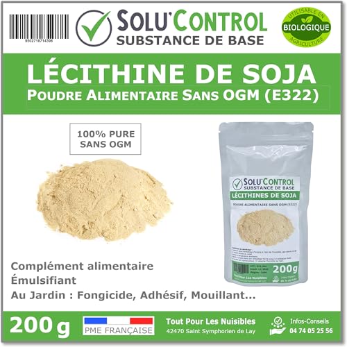 200 gr de Lécithine de Soja sans OGM en sachet refermable - Substance de Base - Complément Alimentaire - Émulsifiante - Jardin : Fongicide - adhésive - mouillante - amplificatriceOrigine certifiée non-OGM : Notre lécithine de soja est garantie sans organismes génétiquement modifiés pour une consommation saine et éthique. Qualité alimentaire supérieure (E322) : Respecte les normes strictes de l'industrie alimentaire, assurant sécurité et pureté. Amélioration cognitive : Richesse en phospholipides essentiels, bénéfiques pour la mémoire et les fonctions cérébrales. Emulsifiant naturel : Idéal pour créer des textures lisses et homogènes dans les produits alimentaires tels que les sauces, pâtes à tartiner et glaces. Action fongicide pour le jardinage : Protège les plantes contre les maladies, renforçant la santé et la vigueur de votre jardin. Adjuvant adhésif et anti-ruissellement : Augmente l'efficacité des traitements phytopharmaceutiques en assurant une distribution uniforme sur les plantes. Facilité d'utilisation : Se mélange aisément sans grumeaux, pour une application simple en cuisine ou au jardin.
