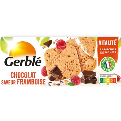 Gerblé Vitalité, Sablé au Chocolat Saveur Framboise, Sans Huile de Palme, 3 Sachets Individuels, 12 Biscuits, 140 g, 206290Biscuits sablés au germe de blé saveur framboise avec des pépites de chocolat noir fondantes, Idéal comme encas à n'importe quel moment de la journée grâce à ses emballages individuels Nutriscore C,-43% de sucres et -67% d'acides gras saturés par rapport à la moyenne des biscuits du marché, Source de magnésium et de vitamine E, Source de fibres Sans huile de palme, Sans colorant ni conservateur conformément à la réglementation en vigueur, Arômes exclusivement naturels, Biscuits riches en saveurs idéals pour les enfants et les adultes Marque engagée : Farine de blé française filière 100% locale et durable, Engagé cacao durable, Boîte en carton recyclé et recyclable, Fabriqué en France Contenu : 1 x Boîte de Sablés au Chocolat saveur Framboise Gerblé Vitalité, 3 sachets de 4 biscuits, Poids : 140 g, 206290