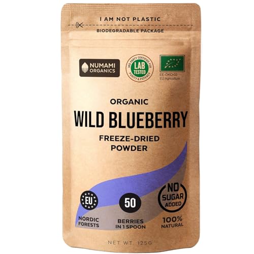 • Numami Poudre de myrtille sauvage biologique pour smoothies, pâtisserie et aromatisation, riche en antioxydants et vitamine C pour obtenir de la poudre de myrtille lyophilisée 125g