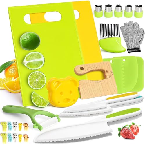 Kits de Cuisine à Jouer, Couteaux de Cuisine Sécurité pour Enfants - Set Montessori 17 Pièces, Couteaux sans pour Apprendre à Couper Fruits et Légumes, Jeu Éducatif Cuisine Enfant à Partir de 2 AnsEnsemble de 28 couteaux pour tout-petits : 1 couteau en bois, 3 couteaux dentelés de différentes tailles et couleurs, 1 gant de cuisine, 1 couteau coupe-pommes de terre, 5 coupe-fruits (en deux parties), 1 éplucheur en Y, 1 coupe-sandwich ours, 3 grattoirs à gâteau, 10 fourchettes à fruits, 1 planche à découper et 1 coffret cadeau. Une variété d'ustensiles de cuisine Montessori pour tout-petits agrémentera les jeux de cuisine des enfants de 2, 3, 4 et 5 ans et plus. Matériaux sains et sûrs : Ces couteaux pour enfants sont fabriqués en bois et en polypropylène alimentaire de haute qualité. Ils sont également fabriqués en acier inoxydable et en polypropylène. Non toxiques, sans BPA, ils sont sûrs à utiliser et de fabrication soignée, résistants à la casse et à la déformation. Offrez à votre enfant une expérience culinaire amusante et enrichissante. Les tout-petits adorent aider en cuisine ! Ce coffret de couteaux, adapté aux enfants, permet aux plus petits de s'adonner à des jeux heuristiques, de cuisiner et à des activités ludiques. Il favorise le développement de la motricité fine, de l'autonomie et de la dextérité, tout en offrant une expérience ludique et stimulante. Idéal pour apprendre les bonnes techniques de couteau et la sécurité en cuisine de manière sûre et stimulante. Un cadeau idéal pour les enfants : les enfants seront ravis de vous accompagner dans la cuisine avec ce coffret de couteaux pour tout-petits. Stimulez leur intérêt et laissez-les profiter des moments de cuisine en famille. Grâce à la pratique, les enfants peuvent améliorer leurs compétences manuelles, renforcer la relation parent-enfant et apprendre de saines habitudes. Idéal pour les cadeaux d'anniversaire, de Noël, pour les paniers de Pâques, les fêtes, la Saint-Valentin, Thanksgiving, Halloween, les articles de fête, les cadeaux d'invités et les bas de Noël. Ustensiles de cuisine complets et assortis pour les tout-petits : avec notre coffret de pâtisserie pour enfants, votre enfant peut découvrir l'intégralité du processus de cuisson : mesurer la farine avec la cuillère doseuse, mélanger avec la cuillère en bois et le fouet, puis façonner les biscuits avec le rouleau à pâtisserie, le tapis de pétrissage et le moule avant de les cuire. cette activité immersive introduit le plaisir de la créativité en cuisine, aide à développer des compétences pratiques et offre une première expérience de pâtisserie inoubliable.