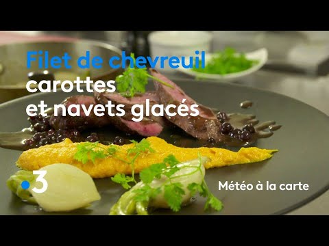 - Dans une sauteuse, chauffer un filet d’huile et une noix de beurre. Colorer les filets de chevreuil sur chaque face. Débarrasser et placer dans un plat du four. Poursuivre la cuisson au four à 180 °C pendant 10 minutes.